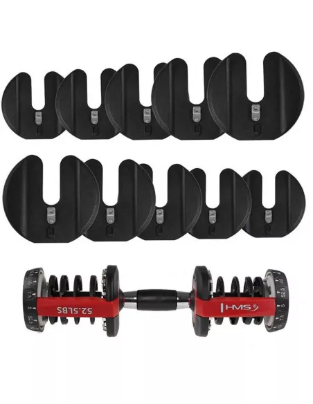 SR-52 HMS to regulowana sztangielka. Zestaw zawiera gryf, 10 talerzy oraz podstawkę. Przyrząd jest idealnym rozwiązaniem dla osób ćwiczących w domu, ale z powodzeniem sprawdzi się też na sali treningowej, zastępując cały stojak tradycyjnych hantli. Zastosowanie innowacyjnego systemu montowania talerzy umożliwia bardzo szybką i łatwą zmianę obciążenia w trakcie treningu. W przeciwieństwie do tradycyjnych hantli, zdjęcie i założenie talerzy nie wymaga każdorazowego odkręcania zacisków oraz nakładania i zdejmowania talerzy. W SR52 wystarczy odłożyć sztangielkę na podstawkę i dwoma pokrętłami ustawić pożądane obciążenie. Po ponownym podniesieniu sztangielki będą znajdować się na niej talerze odpowiadające wybranemu ustawieniu. Produkt został wykonany z materiałów najwyższej jakości. Dużym atutem SR-52 HMS jest uchwyt sztangielki, o ergonomicznym kształcie, pokryty materiałem antypoślizgowym. Regulowane sztangielki marki HMS stanowią innowacyjne rozwiązanie dla miłośników sportów siłowych – 10 talerzy pozwala na dowolną regulację obciążenia w zależności od potrzeb użytkownika. Uwaga: wszystkie wartości obciążenia znajdujące się na produkcie podane są w funtach (lbs).