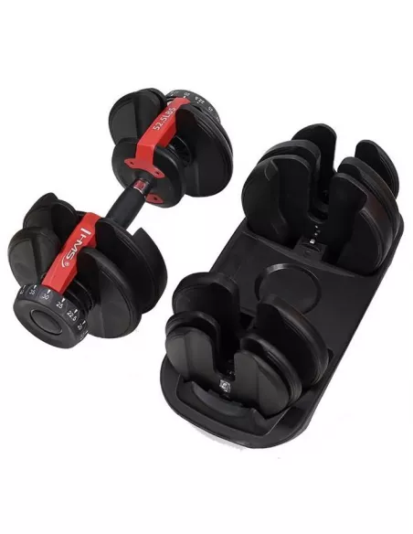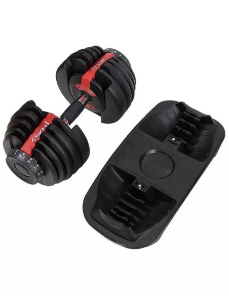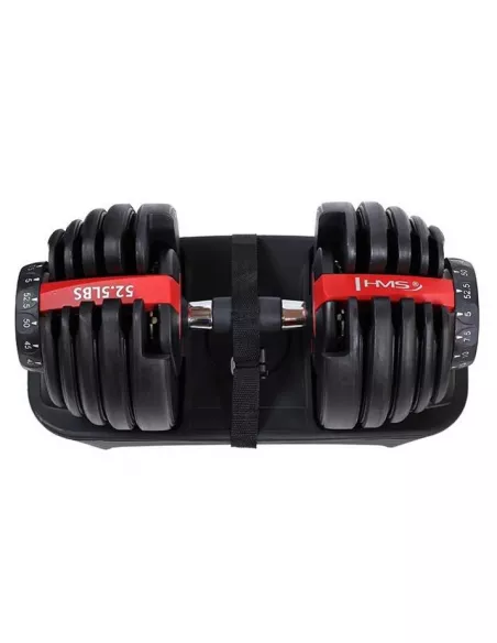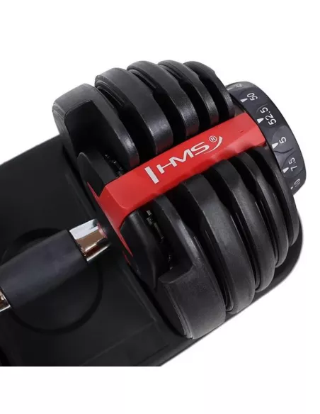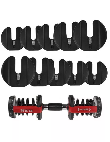 SR-52 HMS to regulowana sztangielka. Zestaw zawiera 2x gryf, 20 talerzy oraz 2x podstawkę. Przyrząd jest idealnym rozwiązaniem dla osób ćwiczących w domu, ale z powodzeniem sprawdzi się też na sali treningowej, zastępując cały stojak tradycyjnych hantli. Zastosowanie innowacyjnego systemu montowania talerzy umożliwia bardzo szybką i łatwą zmianę obciążenia w trakcie treningu. W przeciwieństwie do tradycyjnych hantli, zdjęcie i założenie talerzy nie wymaga każdorazowego odkręcania zacisków oraz nakładania i zdejmowania talerzy. W SR52 wystarczy odłożyć sztangielkę na podstawkę i dwoma pokrętłami ustawić pożądane obciążenie. Po ponownym podniesieniu sztangielki będą znajdować się na niej talerze odpowiadające wybranemu ustawieniu. Produkt został wykonany z materiałów najwyższej jakości. Dużym atutem SR-52 HMS jest uchwyt sztangielki, o ergonomicznym kształcie, pokryty materiałem antypoślizgowym. Regulowane sztangielki marki HMS stanowią innowacyjne rozwiązanie dla miłośników sportów siłowych – 10 talerzy na jednej hantli pozwala na dowolną regulację obciążenia w zależności od potrzeb użytkownika. Uwaga: wszystkie wartości obciążenia znajdujące się na produkcie podane są w funtach (lbs).