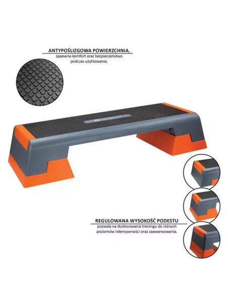 Step wyposażono w antypoślizgową powierzchnię, zapewniającą pewność ruchów nawet podczas dynamicznych ćwiczeń. Gumowe stopki zapobiegają ślizganiu się stepu na różnych powierzchniach, gwarantując stabilność i bezpieczeństwo użytkowania.