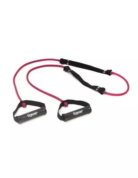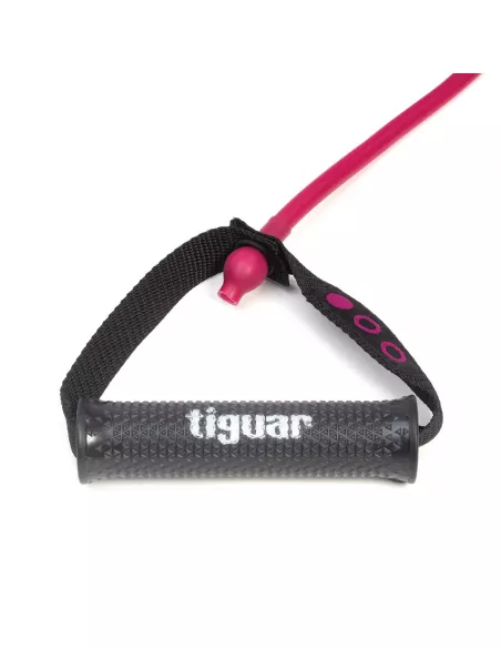 Tubing o długości 215 cm z rączkami oraz specjalnie stworzonymi uchwytami na buty, dzięki którym tubing doskonale trzyma się na stopie podczas ćwiczeń. Dodatkowo uchwyty chronią gumę przed bezpośrednim kontaktem z obuwiem wydłużając jej żywotność. Trening z tiguar double tube jest znacznie bardziej efektywny i ciekawy. Tubingi tiguar wyposażone są w zupełnie nowe rączki stworzone według projektu zainspirowanego innowacyjnymi rozwiązaniami w designie produktowym. Dopasowanie rozmiaru oraz średnicy uchwytu (28 mm), a także jego ergonomiczne wyprofilowanie gwarantują maksymalny komfort podczas ćwiczeń, zwiększają pewność chwytu, zapobiegają ślizganiu się a jednocześnie przykuwają uwagę nowoczesnym designem. Wnętrze rączki wykonane jest z wytrzymałego polipropylenu, a całość pokryta wytrzymałą gumą TPR. Znajdujące się na rączkach naszywki informują użytkownika o stopniu oporu. Długość rączki: 12,5 cm