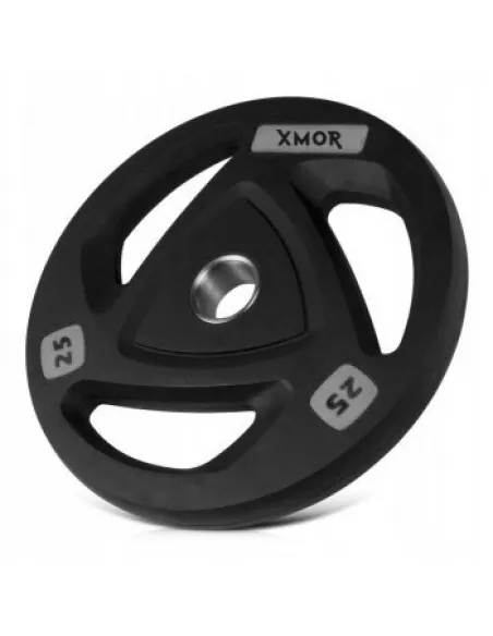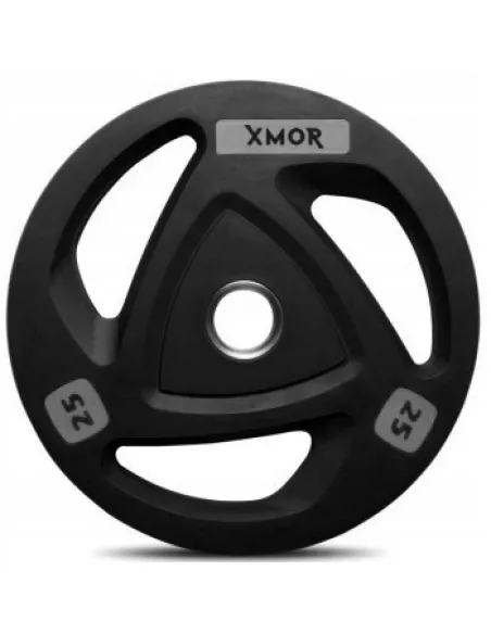 OBCIĄŻENIE OLIMPIJSKIE OGUMOWANE XMOR przeznaczone do gryfu 50 mm, pokryte miękką wytrzymałą gumą. Uformowanie w talerzach komfortowych uchwytów ułatwia zakładanie i zdejmowanie obciążenia, co znacząco usprawnia trening. Gumowe grube pokrycie pomaga zmniejszyć uszkodzenia podłogi oraz zapobiega przed zarysowaniami na stojakach i ścianach. Nasze obciążenia pokryte są gumą HQ dzięki której obciążenia są prawie bezwonne a trening stanie się jeszcze przyjemniejszy. Każde obciążenie posiada oznaczenie wagowe, które ułatwi i usprawni Twój trening. Wysokiej jakości guma z dodatkiem elastomeru powoduje, że na obciążeniach pod wpływem nacisku nie powstają stałe odkształcenia. Obciążenie występuje w 7 różnych wariantach wagowych od 1,25 kg do 25 kg, co umożliwia dokładne dopasowanie ciężaru do warunków i potrzeb treningowych ćwiczącego.