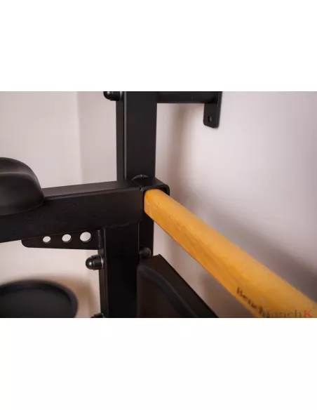 Drewniano – metalowa drabinka sportowa 733B to solidna i praktyczna konstrukcja zapewniona dzięki jakościowym surowcom i nowoczesnej technologii. Drabinka wyposażona jest w zdejmowany, wielofunkcyjny drążek do podciągania PB 710B z 4 hakami z filcowanym podkładem. Prosta regulacja wysokości i pozycji drążka, po obróceniu PB 710B służy jako uchwyt pod sztangę (maksymalna waga sztangi z obciążeniem wynosi 90 kg). W skład zestawu wchodzi również poręcz do ćwiczeń Benchk DB 310B/710B oraz ławka BenchK B310B/710B (ławka nie zawiera żadnego elementu z ekoskóry lub gąbki. Podparcie pod plecy, małe siedzisko i rolki pod kolana wykonane są z integralnego poliuretanu) Ławka jest dwustronna dzięki temu można ją wykorzystać do różnorodnych ćwiczeń. Drabinka znakomicie sprawdzi się, w każdym pomieszczeniu. Zadbaliśmy nawet o najdrobniejsze szczegóły w naszej drabince, wszystkie elementy metalowe są malowane proszkowo (czarny mat) a szczebelki zostały wykonane z litego drewna bukowego (ręcznie olejowane). Każdy dodatkowy element drabinki można zdjąć.