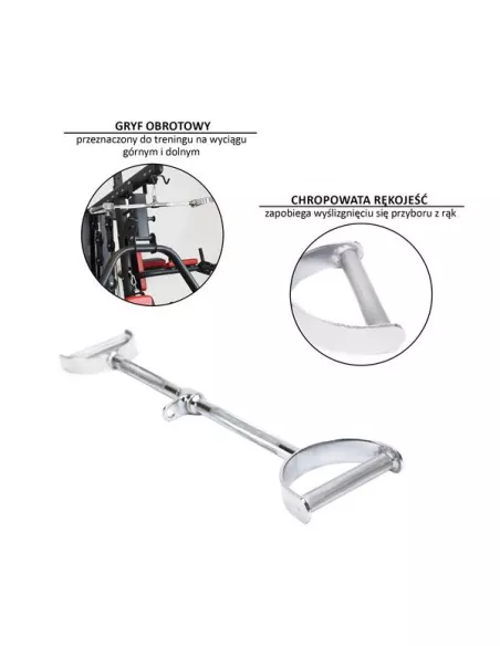 UW16 HMS to gryf obrotowy przeznaczony do treningu na wyciągu górnym i dolnym. Można wykorzystać go do całej gamy ćwiczeń na różne grupy mięśniowe górnych partii ciała, zaczynając od małych grup mięśniowych, jak biceps i triceps, przez przedni i boczny akton mięśni naramiennych, aż po mięśnie najszersze i prostownik grzbietu.