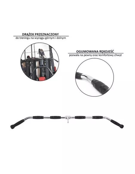 UW14 HMS to drążek przeznaczony do treningu na wyciągu górnym i dolnym. Można wykorzystać go do całej gamy ćwiczeń na różne grupy mięśniowe górnych partii ciała, zaczynając od małych grup mięśniowych, jak biceps i triceps, przez przedni i boczny akton mięśni naramiennych, aż po mięśnie najszersze oraz prostownik grzbietu. Wykonany jest z wysokiej jakości stali, co umożliwia trening ze znacznym obciążeniem. Jego długość oraz ilość ogumowanych rękojeści gwarantuje wiele możliwości chwytu, od bardzo wąskiego do bardzo szerokiego.