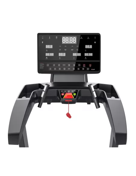 Bieżnia komercyjna o maksymalnej wadze użytkownika do 200 kg, napędzana silnikiem o mocy 6 KM AC, oferuje prędkość od 1 do 25 km/h oraz regulację kąta nachylenia od 0 do 15%. Z wyświetlaczem LED i 36 programami treningowymi umożliwiającymi monitorowanie czasu, dystansu, prędkości, spalonych kalorii i pulsu. Wyposażona w czujniki pomiaru pulsu, telemetryczny pomiar pulsu, amortyzację 8 elastomerów, przyciski szybkiego wyboru prędkości i kąta nachylenia, uchwyty na bidony oraz kółka transportowe.
