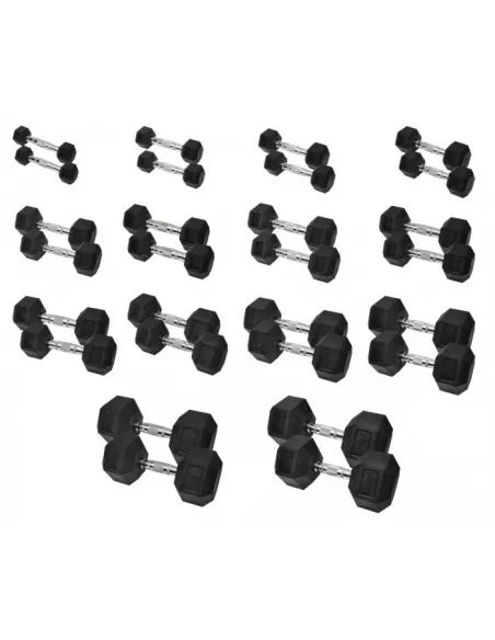 Stojak w pełni mieści zestaw hantli hex 2x 1-20 kg lub 2x 2,5 - 25 kg