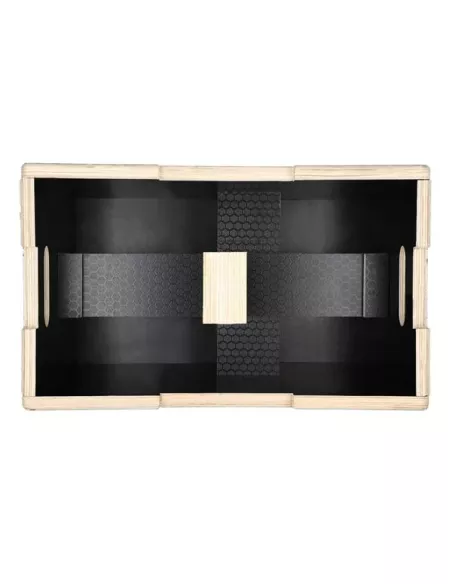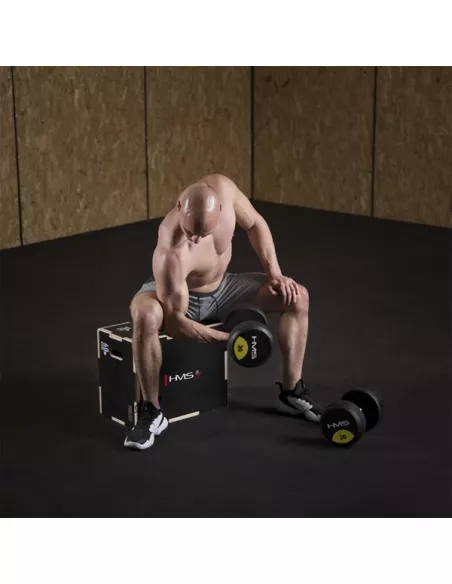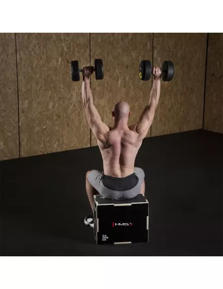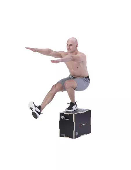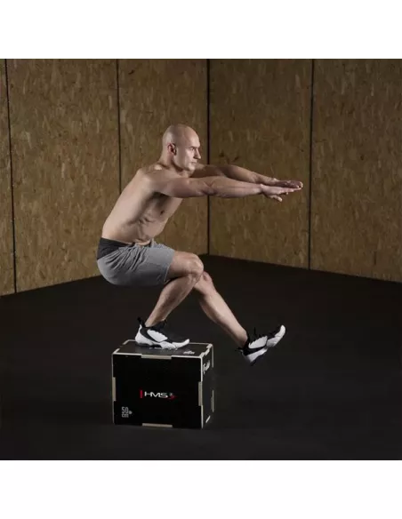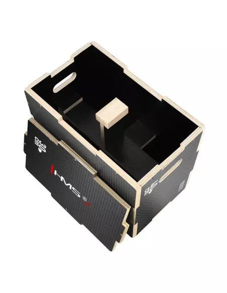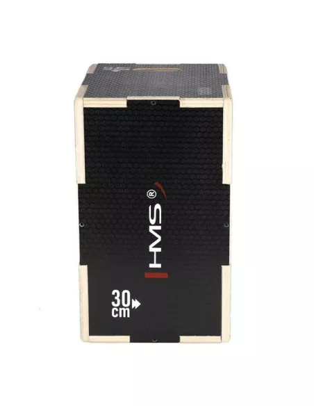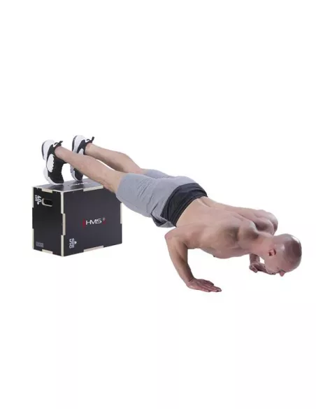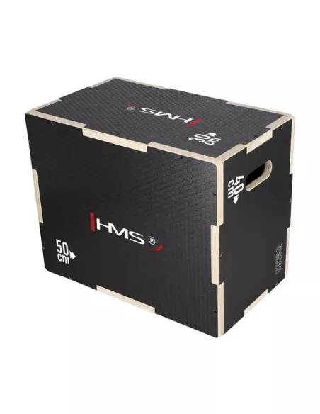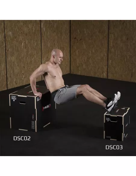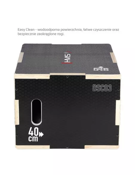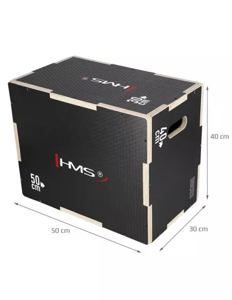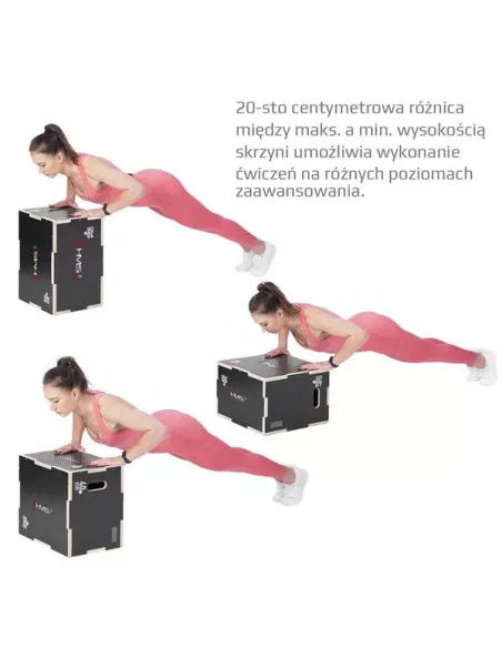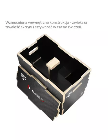 DSC03 HMS to drewniana skrzynia, przeznaczona do treningu typu crossfit. Dzięki przewróceniu skrzyni na różne boki, możemy uzyskać trzy wysokości i dostosować je, do poziomu zaawansowania osoby trenującej. Materiał skrzyni, to drewniane sklejki, które tworzą puzzlowe zakładki, gwarantując stabilność i trwałość konstrukcji. Dodatkowo, ścianki pokryte są specjalną powłoką, która zabezpiecza przed ślizganiem się obuwia, w trakcie ćwiczeń. Kolejną zaletą powłoki jest to, że po skończonym treningu, bardzo łatwo można usunąć z niej zabrudzenia. Krawędzie skrzyni zostały zeszlifowane, a środek wzmocniony, dzięki czemu trening jest bezpieczny. Dwa wycięte otwory, ułatwiają przenoszenie skrzyni.