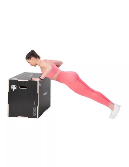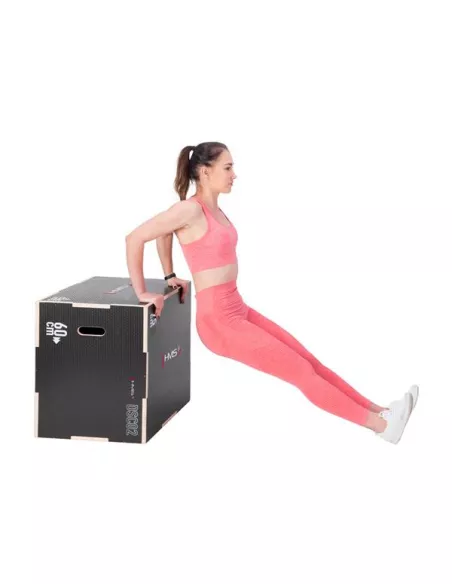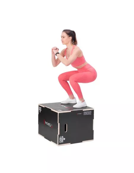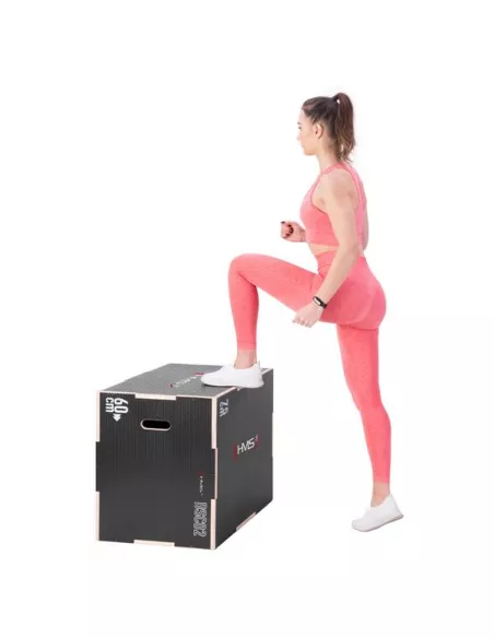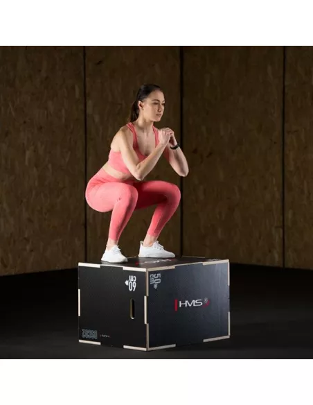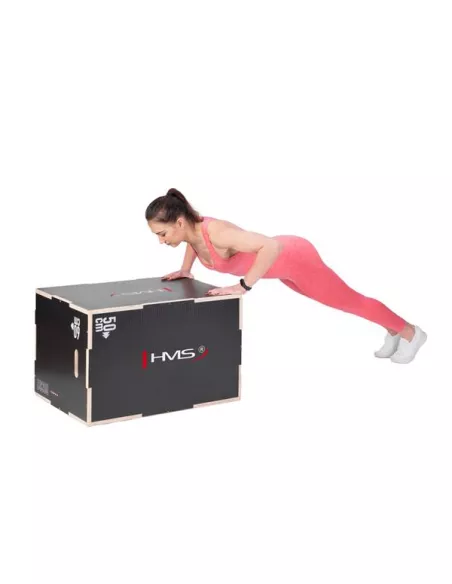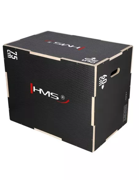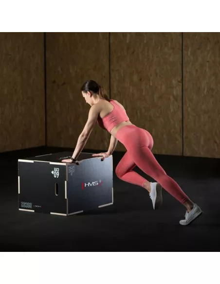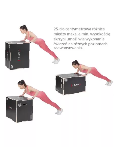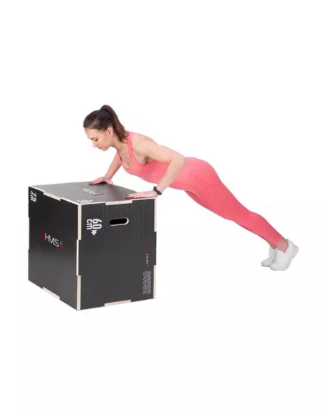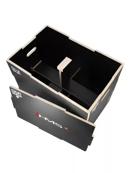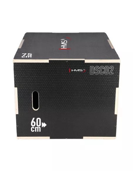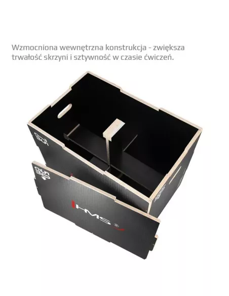 DSC02 HMS to drewniana skrzynia, przeznaczona do treningu typu crossfit. Dzięki przewróceniu skrzyni na różne boki, możemy uzyskać trzy wysokości i dostosować je, do poziomu zaawansowania osoby trenującej. Materiał skrzyni, to drewniane sklejki, które tworzą puzzlowe zakładki, gwarantując stabilność i trwałość konstrukcji. Dodatkowo, ścianki pokryte są specjalną powłoką, która zabezpiecza przed ślizganiem się obuwia, w trakcie ćwiczeń. Kolejną zaletą powłoki jest to, że po skończonym treningu, bardzo łatwo można usunąć z niej zabrudzenia. Krawędzie skrzyni zostały zeszlifowane, a środek wzmocniony, dzięki czemu trening jest bezpieczny. Dwa wycięte otwory, ułatwiają przenoszenie skrzyni.
