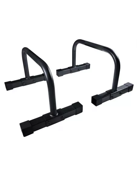 Posiadają solidną skręcaną śrubami stalową konstrukcję ze stabilnymi podstawami zabezpieczonymi antypoślizgową gumą. Mogą być używane na siłowni, w domu lub na świeżym powietrzu w celu wzmocnienia dłoni, przedramion, barków, pleców i mięśni core. Świetnie nadają się do pompek, L-stis, planche czy pompek w staniu na rękach. Czarne proszkowe wykończenie z radełkowaniem poręczy o średnicy 32 mm zapewnia pewny i wygodny chwyt.