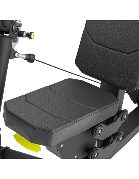 Maszyna posiada aż pięć stopni regulacji wysokości siedziska, dzięki czemu każdy użytkownik dopasuje ją do swojego wzrostu. Regulacja siedziska jest oparta na siłownikach, dzięki czemu nie musisz schodzić z maszyny aby dokonać regulacji.