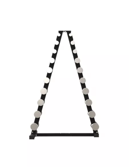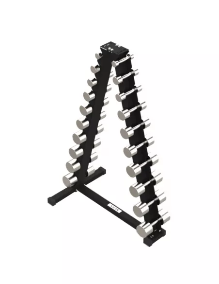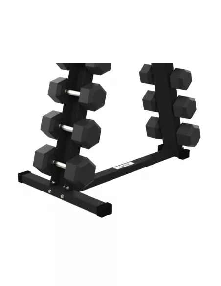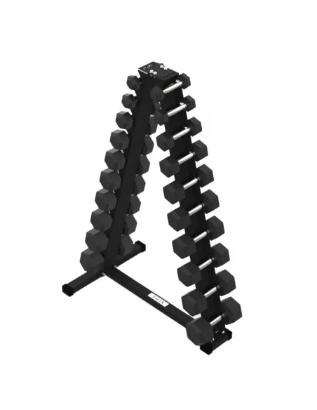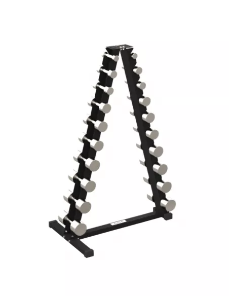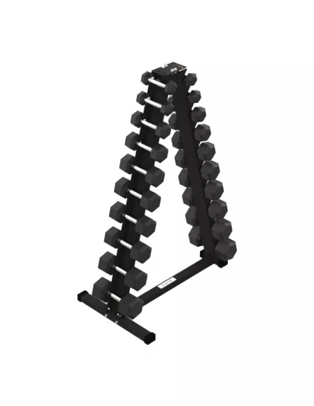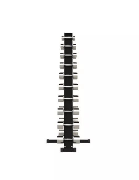 Stojak pomieści zestaw hantli: 2 x 1-10 kg (2 x 1 kg, 2 x 2 kg, 2 x 3 kg, 2 x 4 kg, 2 x 5 kg, 2 x 6 kg, 2 x 7 kg, 2 x 8 kg, 2 x 9 kg i 2 x 10 kg).