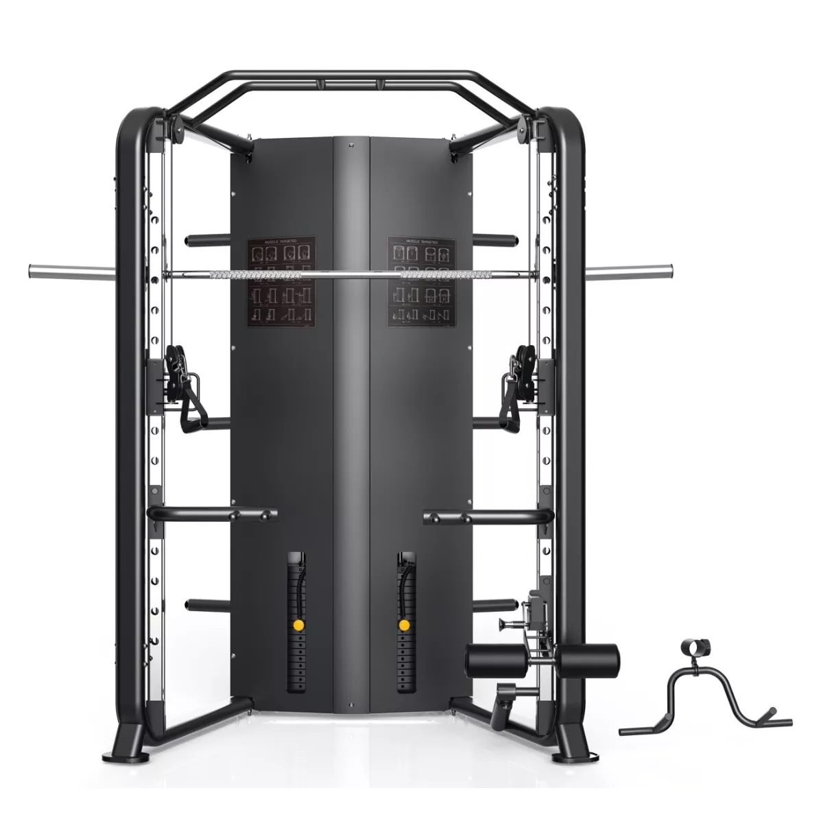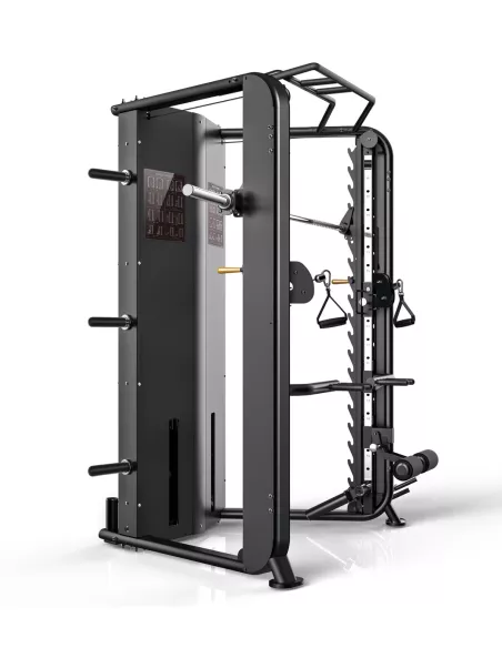 | W zestawie dodatki | Uchwyty do wyciągu, Uchwyt V, Sztanga, Uchwyt do martwego ciągu, Uchwyt na nogi do brzuszków, maszyna Smitha - max. obciążenie gryfu - 200 kg |