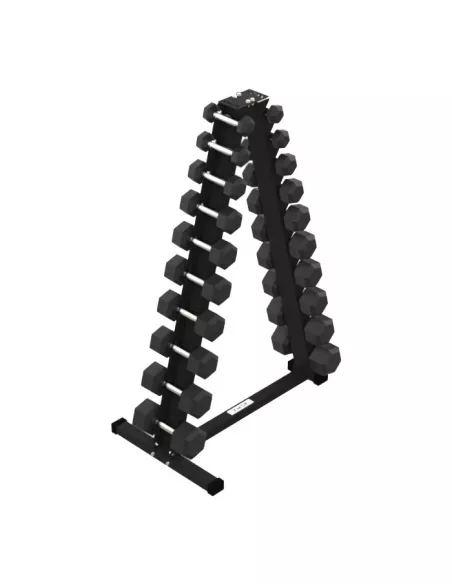 Stojak pomieści zestaw hantli: 2 x 1-10 kg (2 x 1 kg, 2 x 2 kg, 2 x 3 kg, 2 x 4 kg, 2 x 5 kg, 2 x 6 kg, 2 x 7 kg, 2 x 8 kg, 2 x 9 kg i 2 x 10 kg).