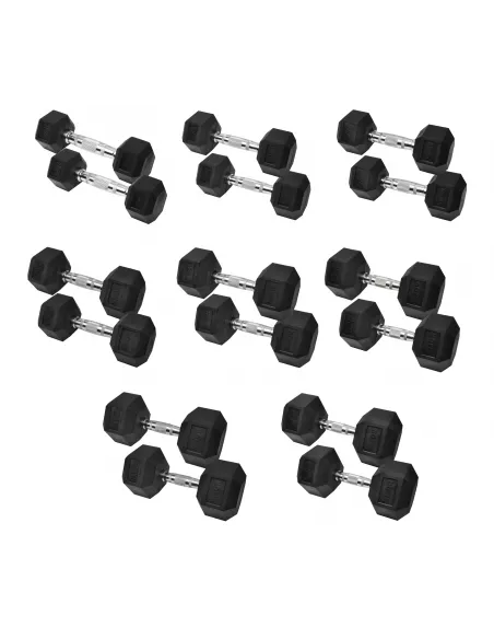 Solidne hantle marki XMOR FITNESS o heksagonalnym kształcie, spełnią oczekiwania zarówno profesjonalistów jak i początkujących. Szeroka gama obciążeń sprawia, że każdy znajdzie obciążenie jakiego poszukuje. Dzięki hantlą hex XMOR FITNESS poprawisz swoją siłę oraz koordynację. Budowa i kształt hantlii sprawia, że są one wygodne w użyciu i nie przemieszczają się podczas treningu a ogumowane głowice w znacznym stopniu zmniejszają hałas, uszkodzenia podłogi oraz uszkodzenia samej hantli. Wskaźnik wagi na każdej hantli w znaczny sposób ułatwi i przyspieszy odszukanie potrzebnej hantli o danym obciążeniu. W skład zestawu wchodzi hanta: 2 x 2.5 kg, 2 x 5 kg, 2 x 7.5 kg, 2 x 10 kg, 2 x 12.5 kg, 2 x 15 kg, 2 x 17.5 i 2 x 20 kg