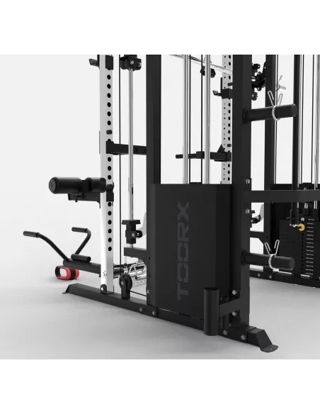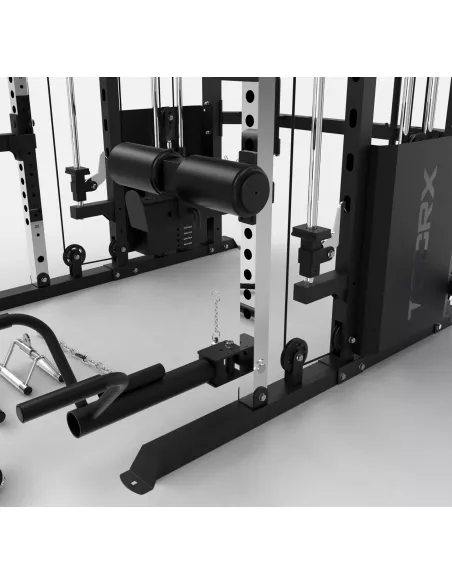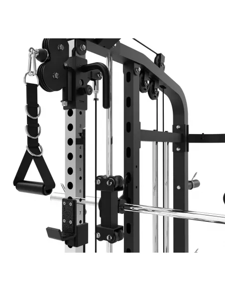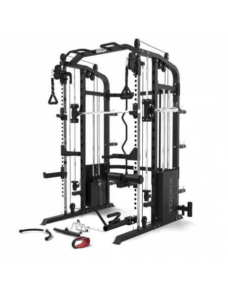 podwójny wyciąg, maszyna smith'a, rack. 2 krótkie uchwyty pod sztangę (J-hooks), 2 długie podpory bezpieczeństwa (safety spotter arms) z podporą pod nogi, drążek do podciągania, poręcze do pompek, uchwyt do przechowywania gryfów, 6 uchwytów do przechowywania obciążeń ø50 mm, 8 zacisków ø49 mm. Dodatki: opaska na kostkę, linka, landmine, 2 Y- uchwyty, V-uchwyt, krótki prosty drążek, prosty oraz łamany drążek.
