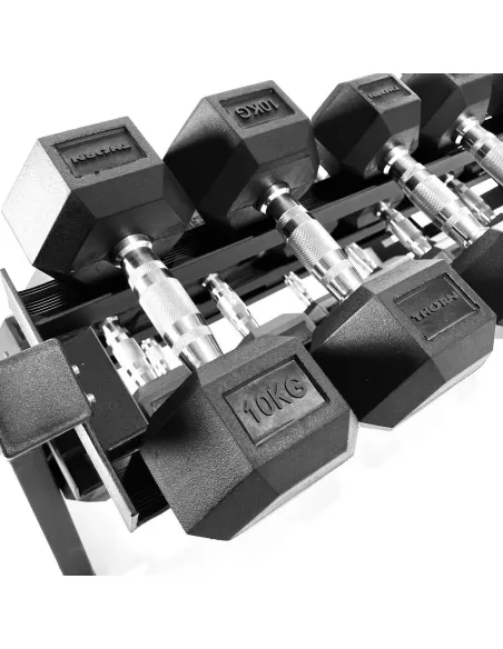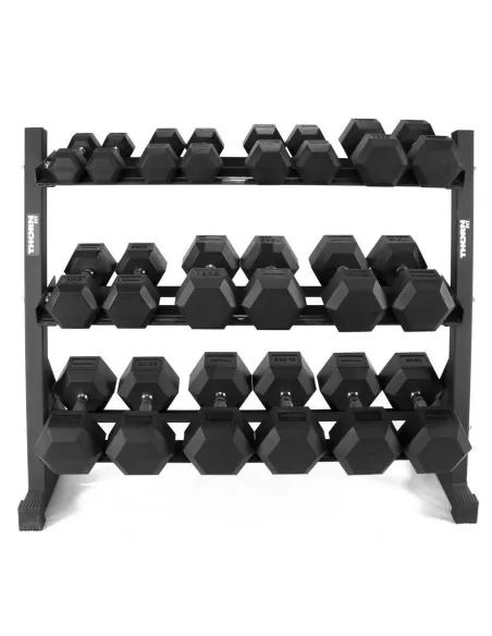 Konstrukcja wolnostojąca, która umożliwia poprawne składowanie hantli. Posiada trzy poziomy półek do składowania o szerokości 1,2m każda. Ustalenie miejsca do odkładania pod lekkim kątem pozwala na wygodne i bezpieczne odłożenie HEX.