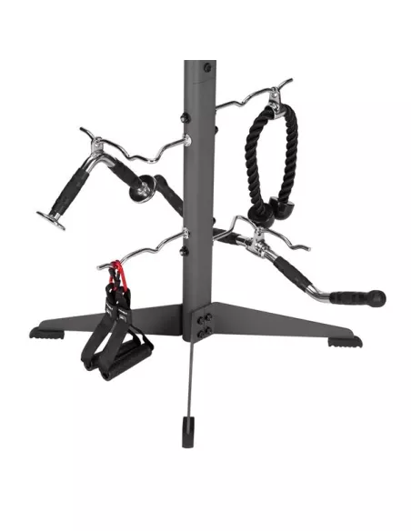 STR33 to stojak, który ma szerokie nogi w dolnej części, co zapewnia mu dużą stabilność i wytrzymałość. Stojak jest wyposażony w osiem niezależnych haków, na których możesz wieszać różne akcesoria fitness, takie jak skakanki, uchwyty czy sznury. Każdy hak wytrzyma maksymalne obciążenie do 30 kg, więc nie musisz się martwić o uszkodzenie stojaka lub sprzętu.