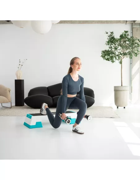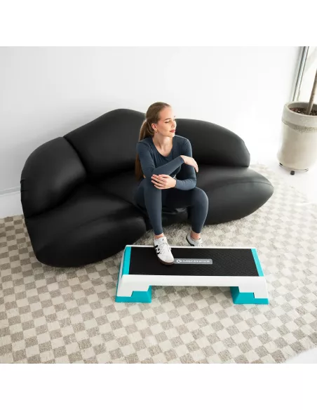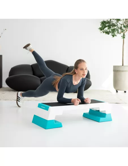 Step wyposażono w antypoślizgową powierzchnię, zapewniającą pewność ruchów nawet podczas dynamicznych ćwiczeń. Gumowe stopki zapobiegają ślizganiu się stepu na różnych powierzchniach, gwarantując stabilność i bezpieczeństwo użytkowania.