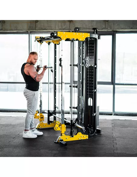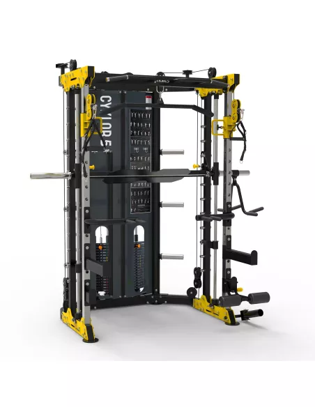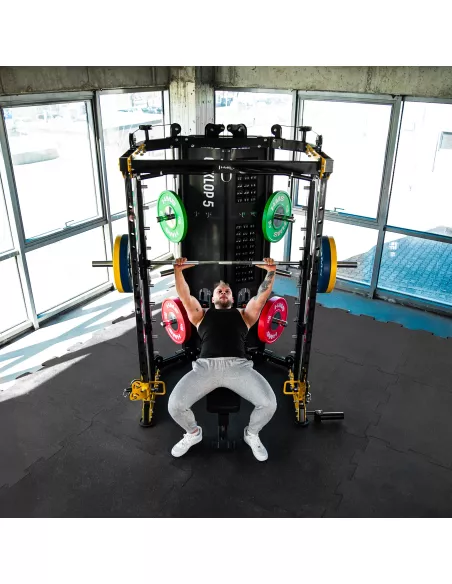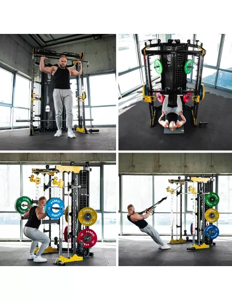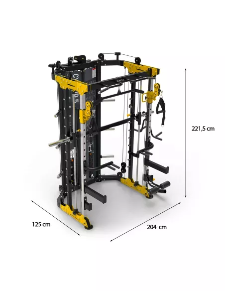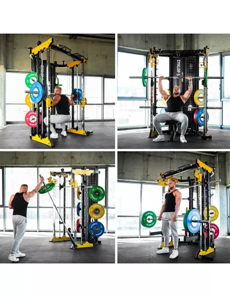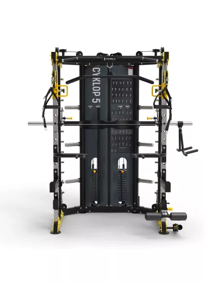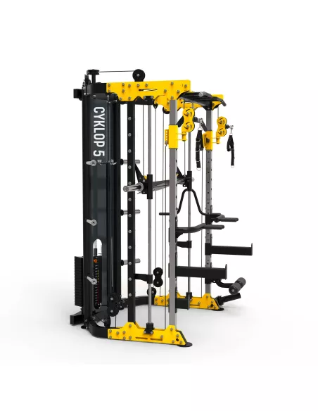 Cyklop 5 to zaawansowany atlas treningowy, który łączy w sobie funkcjonalność wielostanowiskowej maszyny siłowej z bezpieczeństwem i wygodą użytkowania. Dzięki dwóm niezależnym stosom po 90 kg, suwnicy Smitha, licznym uchwytom i dodatkom, Cyklop 5 oferuje kompleksowy trening całego ciała – od mięśni górnych partii aż po nogi.