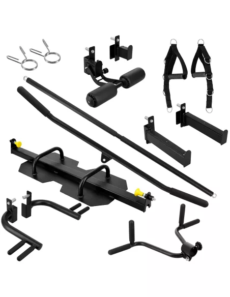 w zestawie znajdują się różnego rodzaju uchwyty, są to: uchwyty standardowe, uchwyt długi prosty, uchwyt do wyciągu górnego, regulowane uchwyty pojedyncze, a także specjalny hak na montaż taśm oraz dwa zaciski sprężynowe.