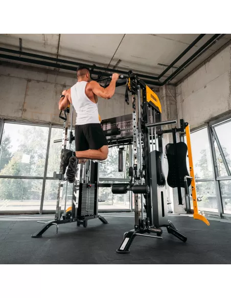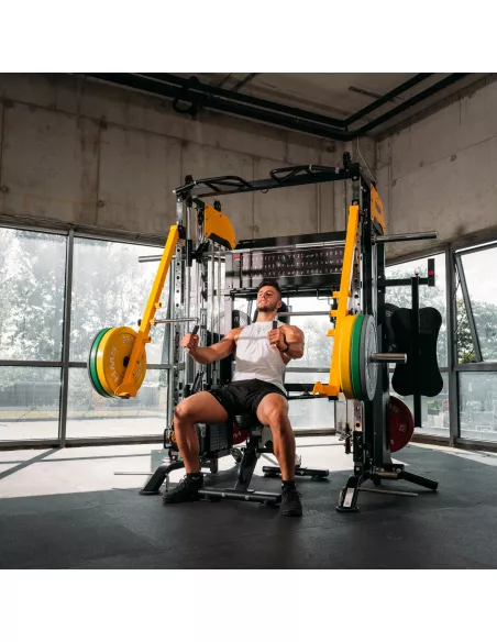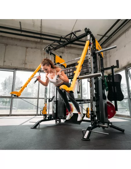 Cyklon X został stworzony z najwyższej jakości stali, co zapewnia jego niezwykłą wytrzymałość i trwałość, nawet przy intensywnym użytkowaniu. Stabilna podstawa gwarantuje pełne bezpieczeństwo podczas każdego ćwiczenia, eliminując ryzyko chwiania się maszyny. Wyciągi i suwnica poruszają się płynnie i bezszelestnie dzięki precyzyjnie dobranym łożyskom