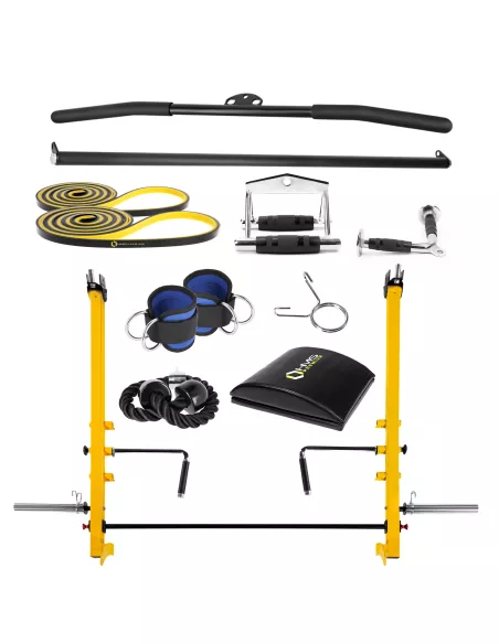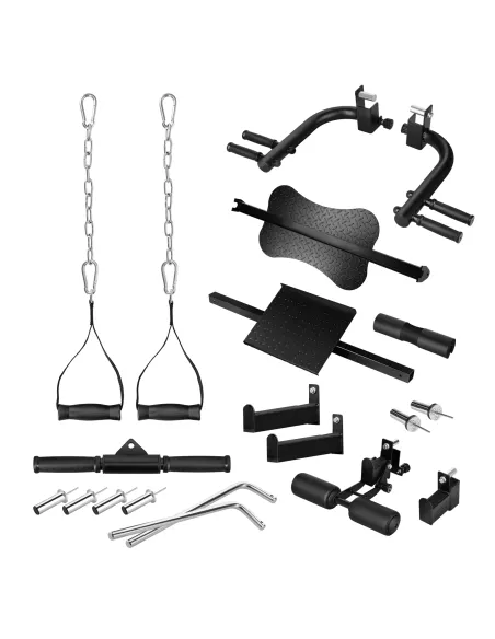 w zestawie znajduje się szereg różnego rodzaju uchwytów, są to: uchwyty standardowe, uchwyt krótki prosty, uchwyt do wyciągu górnego, uchwyt na sztangę landmine, sznur (lina treningowa), uchwyt trójkątny, uchwyt podwójny, łańcuchy i uchwyt do przechowywania gryfu