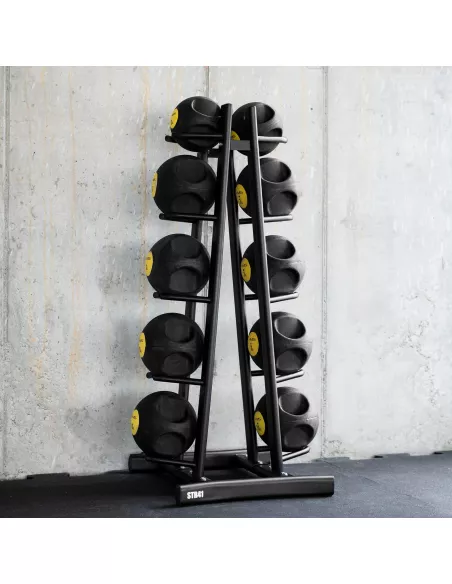 STR41 to praktyczny i kompaktowy stojak na piłki lekarskie, który pomaga w organizacji sprzętu treningowego i maksymalnym wykorzystaniu przestrzeni. Dzięki swojej wysokiej konstrukcji i pojemności do 10 piłek w różnych wagach, jest idealnym rozwiązaniem dla siłowni, studiów fitness oraz domowych stref treningowych.