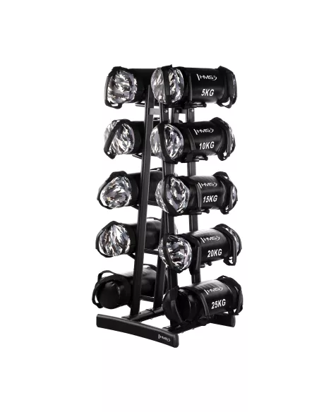 Stojak oferuje więcej niż tylko przechowywanie piłek – przemyślana konstrukcja pozwala na wykorzystanie uchwytów do przechowywania innych akcesoriów, takich jak power bagi, piłki slam ball, worki treningowe czy mniejsze sand bagi. Dzięki temu STR41 staje się uniwersalnym rozwiązaniem dla każdej przestrzeni fitness.