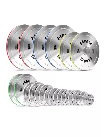 Zestaw zawiera pary talerzy w wagach: 0,25 kg, 0,5 kg, 1 kg, 1,25 kg, 1,5 kg, 2 kg, 2,5 kg, 5 kg, 10 kg, 15 kg, 20 kg i 25 kg, co pozwala na stopniowe zwiększanie ciężaru i precyzyjne dopasowanie treningu do indywidualnych potrzeb.