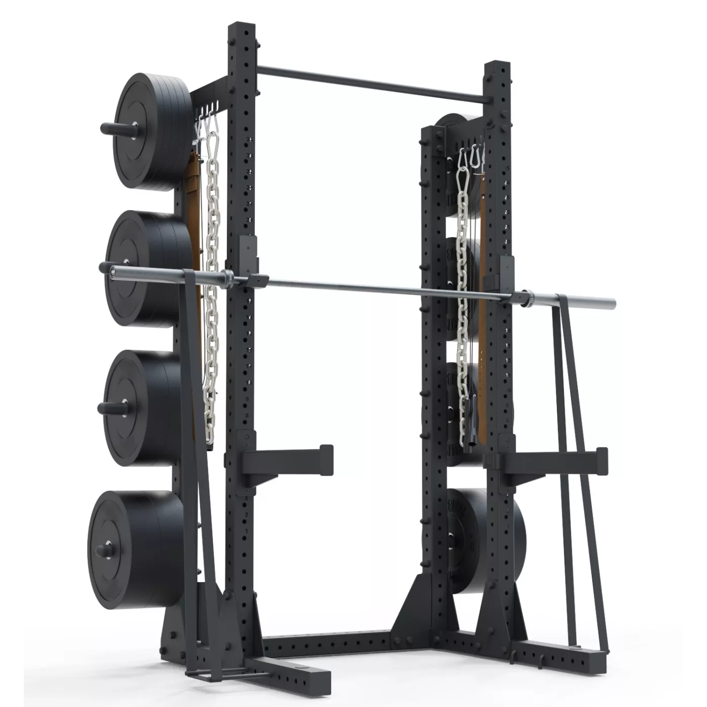Ta profesjonalna klatka łączy w sobie solidną konstrukcję klasycznego squat standu z rozbudowanym systemem przechowywania obciążenia. Zaprojektowany z myślą o maksymalnej stabilności i oszczędności miejsca, stanowi idealne rozwiązanie do domowych siłowni typu garage gym oraz komercyjnych stref treningu siłowego.