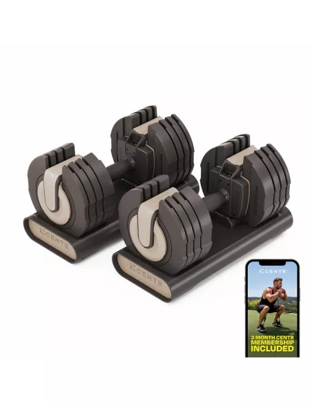 W zestawie: 2 x hantle Centr Smart Stack 50 oraz 3-miesięczny dostęp do aplikacji Centr z planami treningowymi, dietą i wsparciem mentalnym.