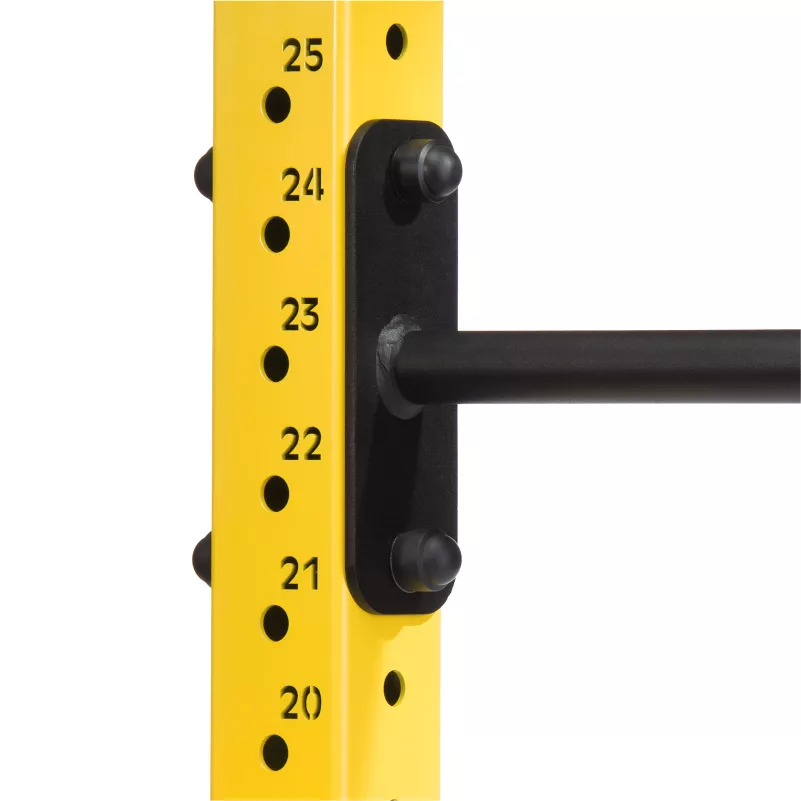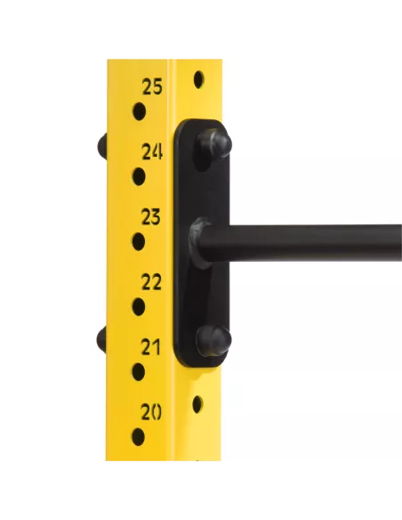 Górne belki posiadają haki na akcesoria (np. gumy lub łańcuchy), a u podstawy znajdują się tuleje do pionowego przechowywania gryfów.
