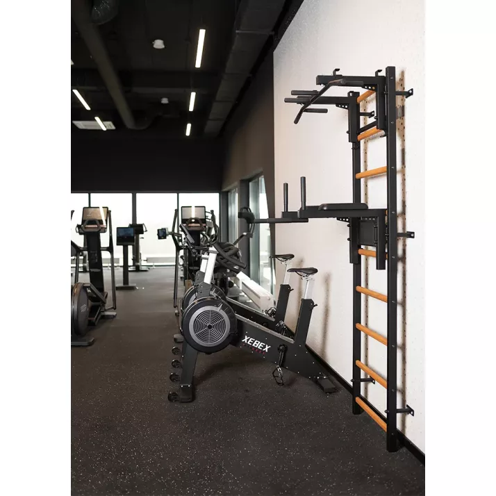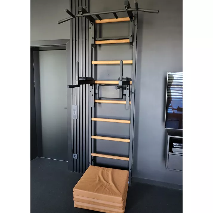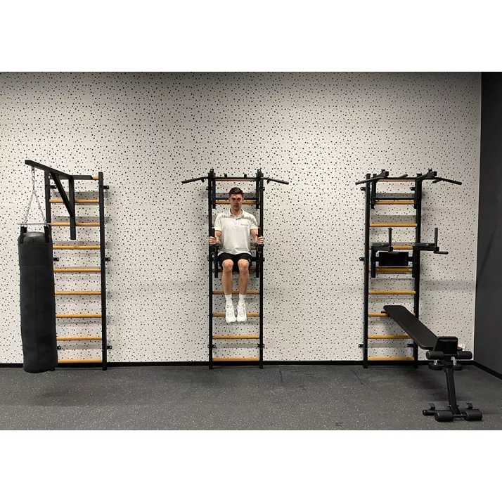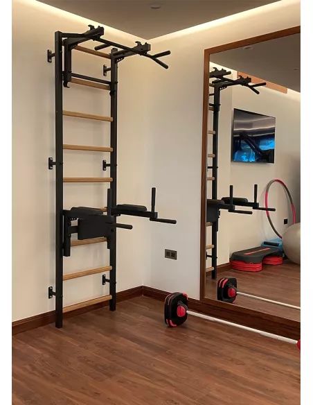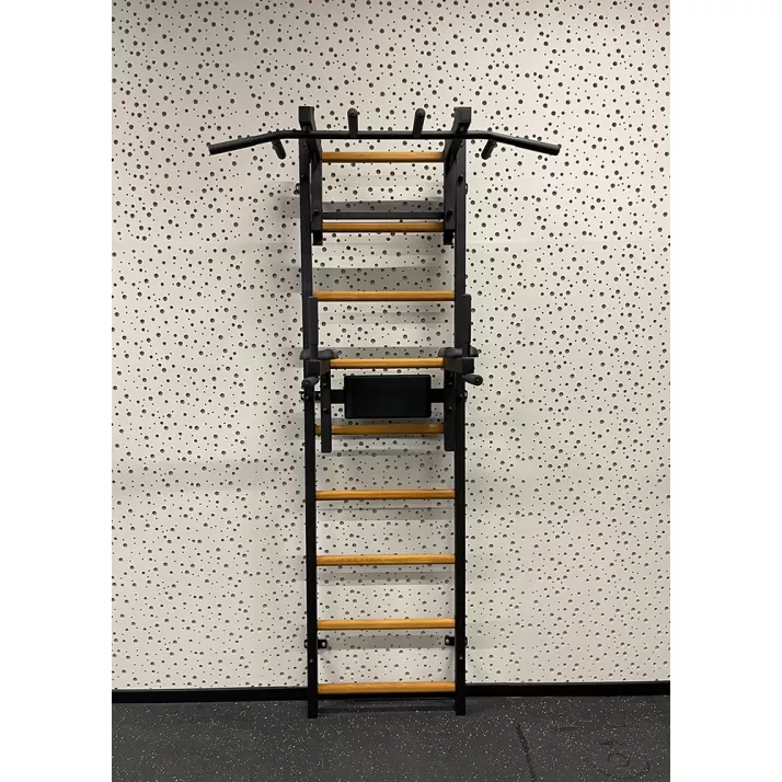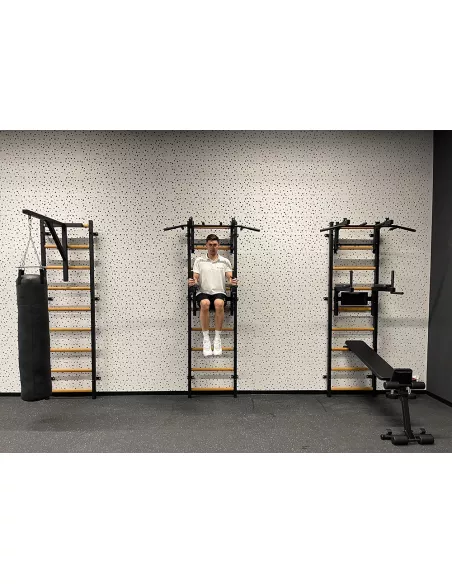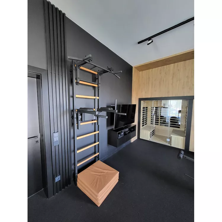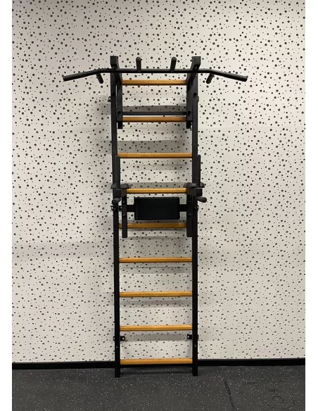 drabinkę, regulowany drążek do podciągania z 6-cioma uchwytami, poręcze do ćwiczeń z podparciem pod plecy. |