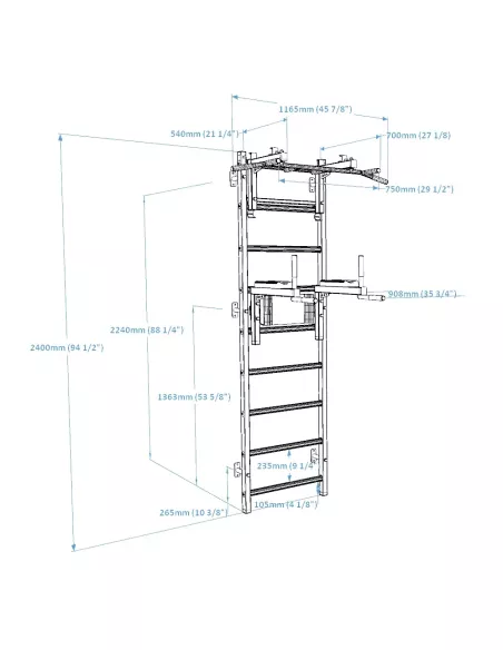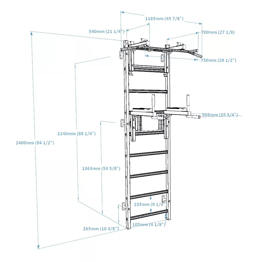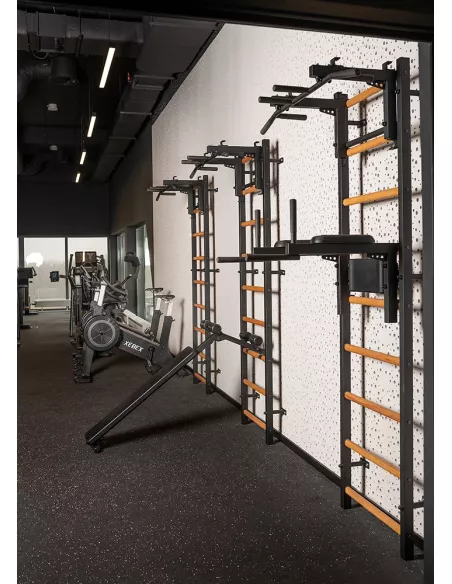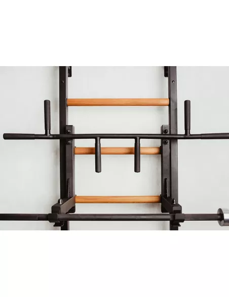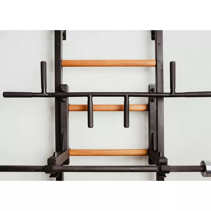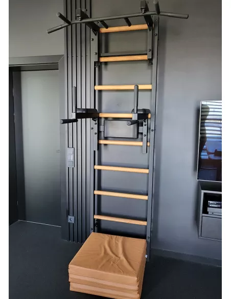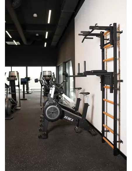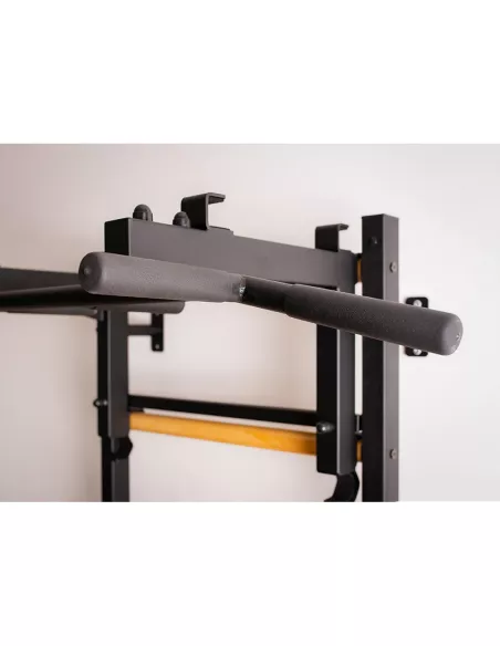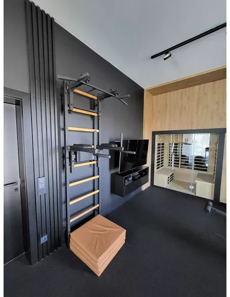 drabinkę, regulowany drążek do podciągania z 6-cioma uchwytami, poręcze do ćwiczeń z podparciem pod plecy. |