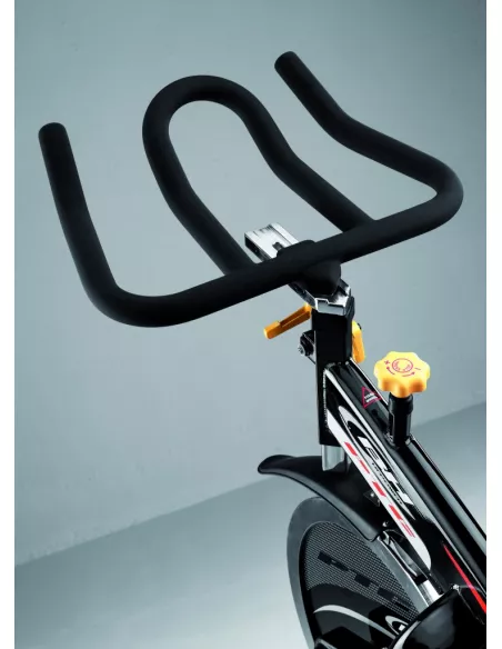 Rower spinningowy przeznaczony do półprofesjonalnych zastosowań. Wyposażony w przednie i tylne stabilizatory redukujące drgania i wibracje podczas intensywnych treningów. Osłona koła zamachowego zapewnia ochronę przed wszelkimi płynami, które powodują korozje stali. Możliwość korzystania z telemetrycznego systemu pomiaru pulsu.